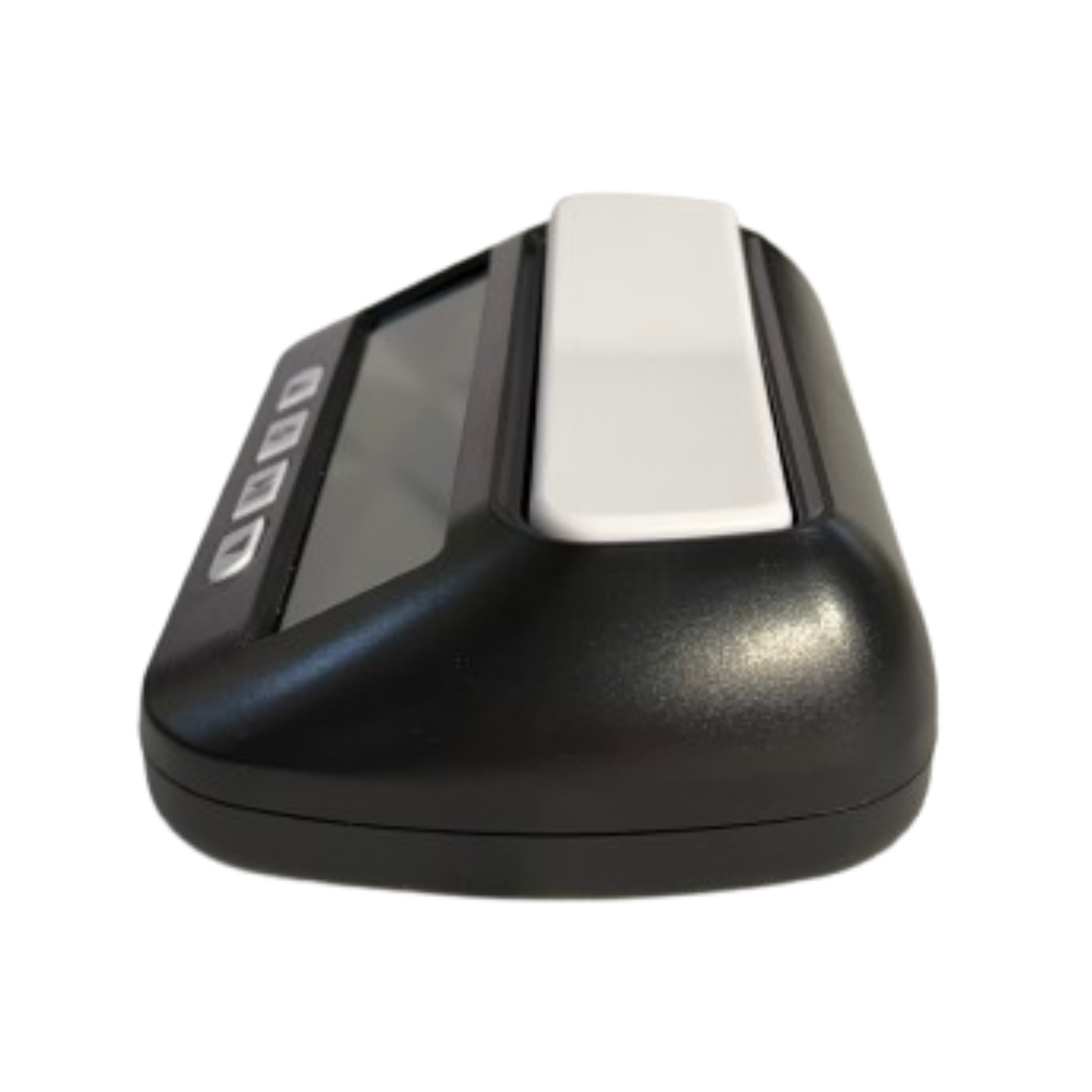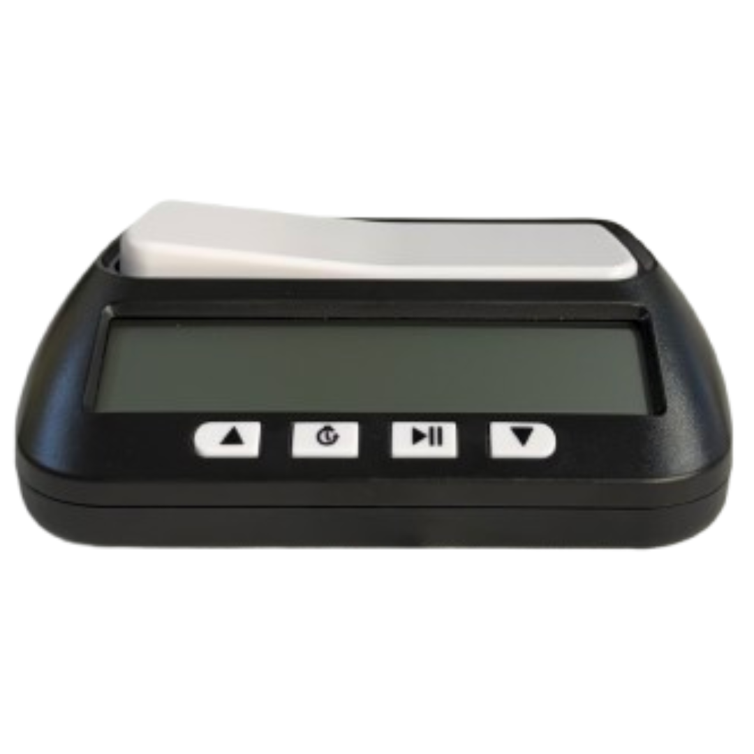 Rellotge d'escacs de color negre. Inclou funció de temps bàsica, així com funcions de temps avançades amb increment i delay. És petit i portàtil. Funciona amb dues piles AA, que no venen incloses.