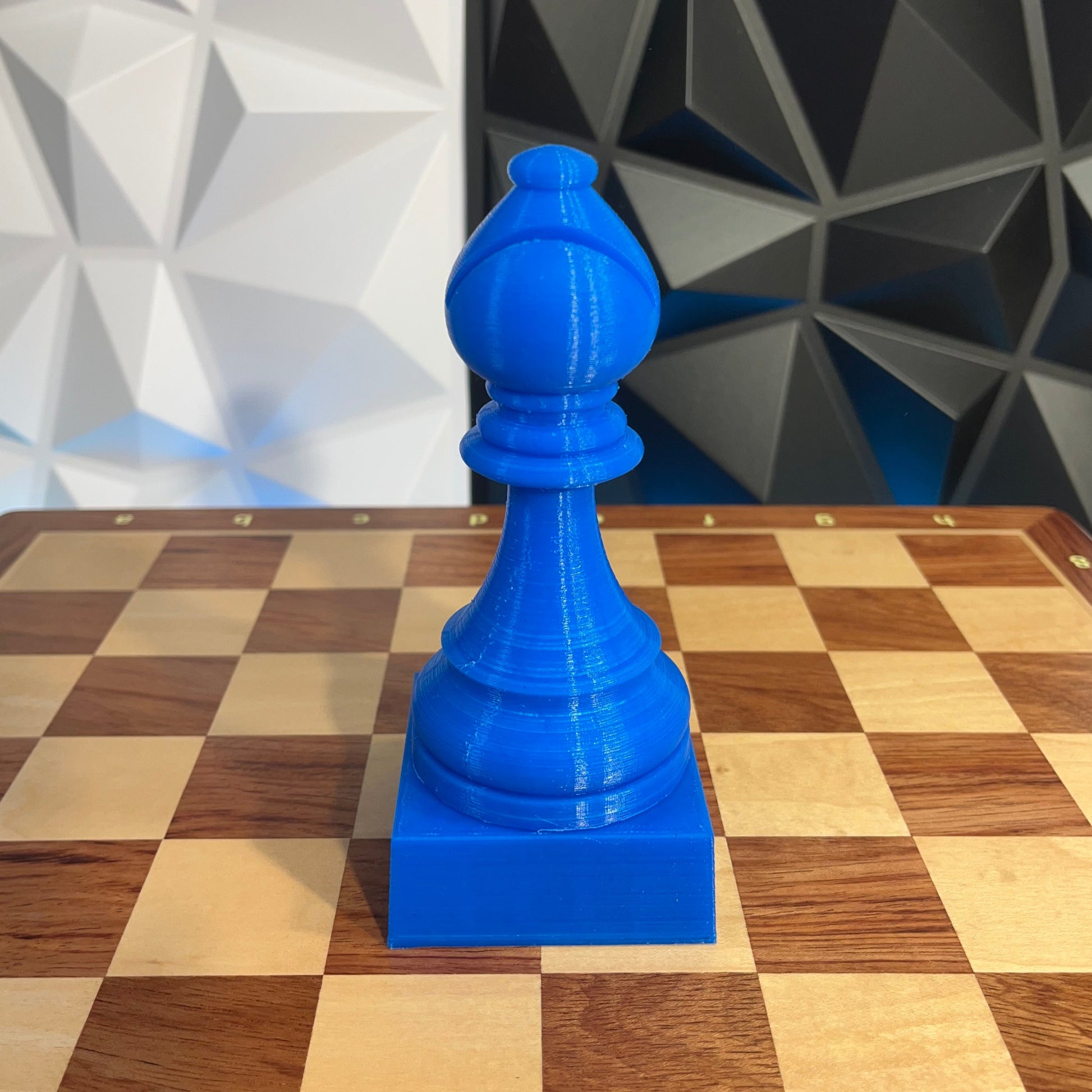 Trofeu fet amb impressora 3D amb la forma d'un alfil gegant d'escacs. Mesura 15cm d'alt (12,5cm l'alfil + 2,5cm el pedestal). Actualment està disponible en blau. Contacteu-nos si ho voleu en un altre color.
