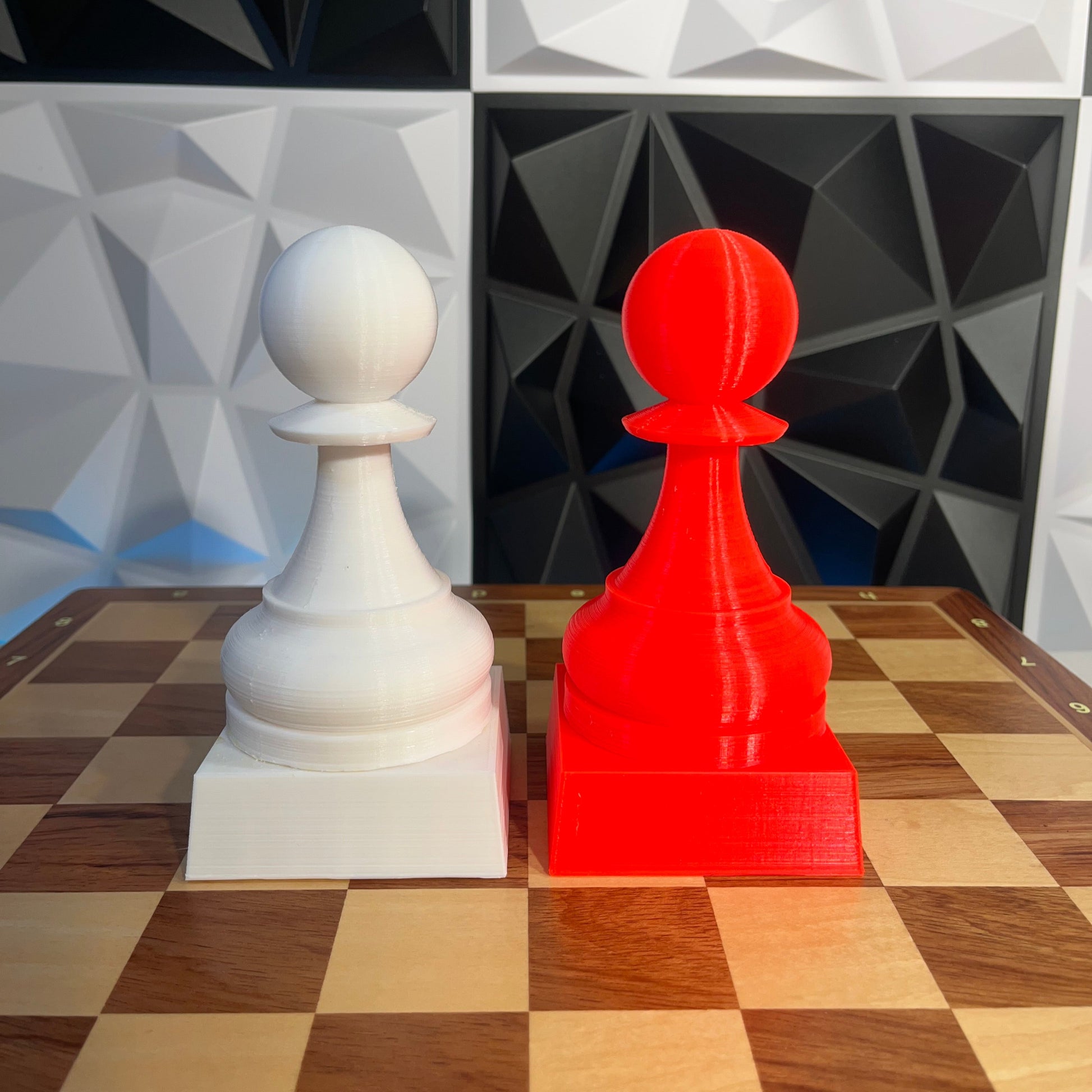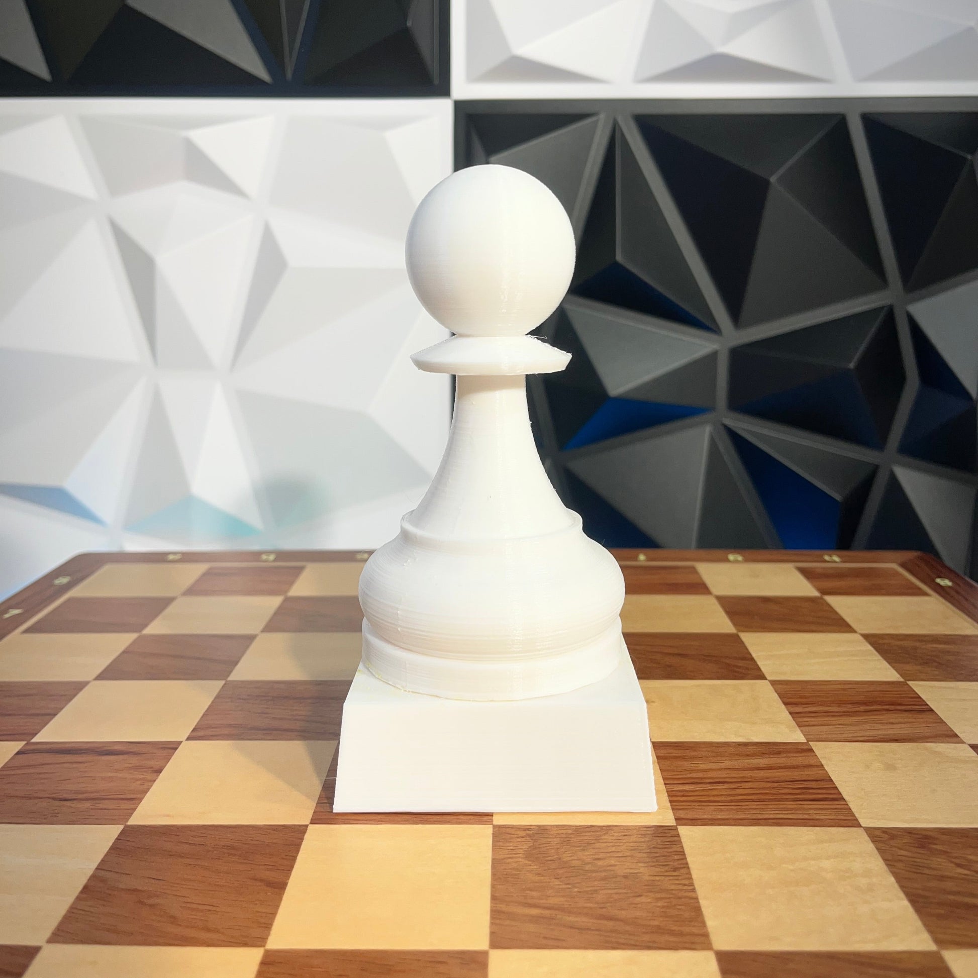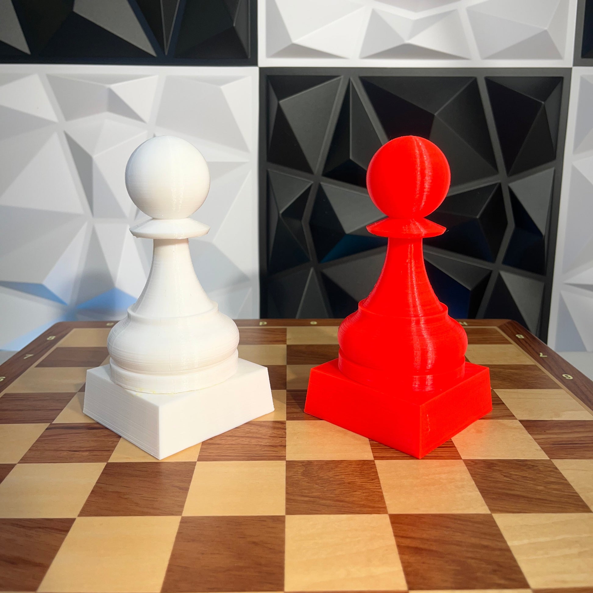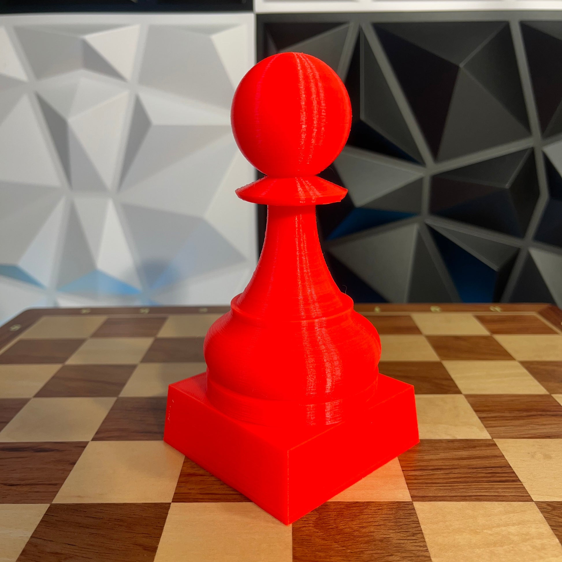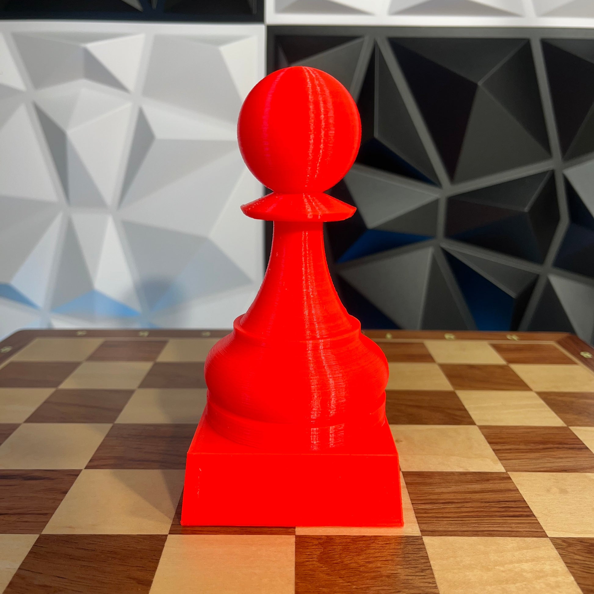 Trofeu fet amb impressora 3D amb la forma d'un peó gegant d'escacs. Mesura 15cm d'alt (12,5cm el peó + 2,5cm el pedestal). Actualment està disponible en blanc i vermell. Contacteu-nos si ho voleu en un altre color.