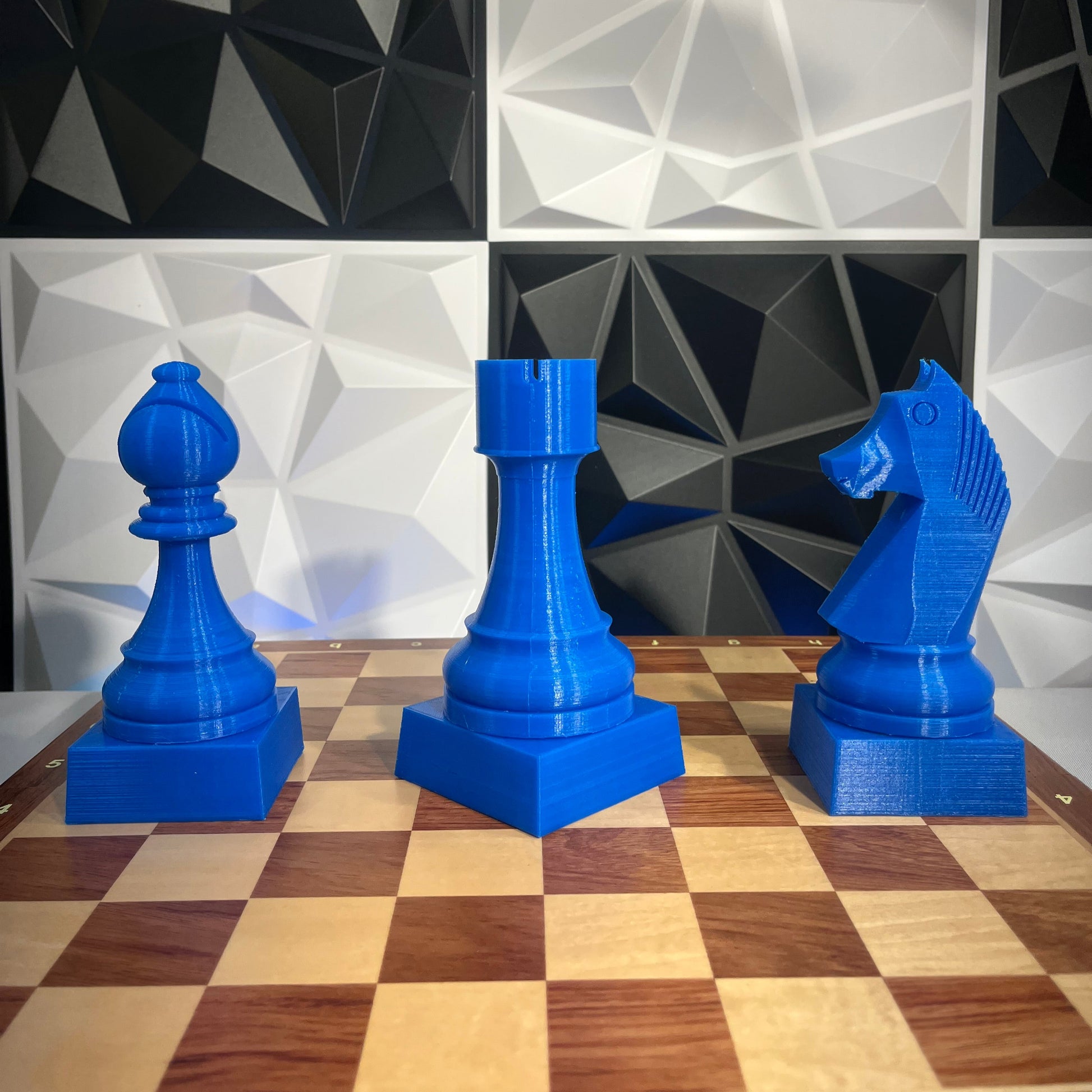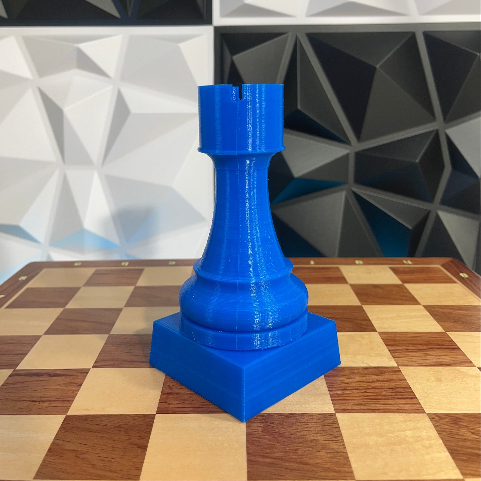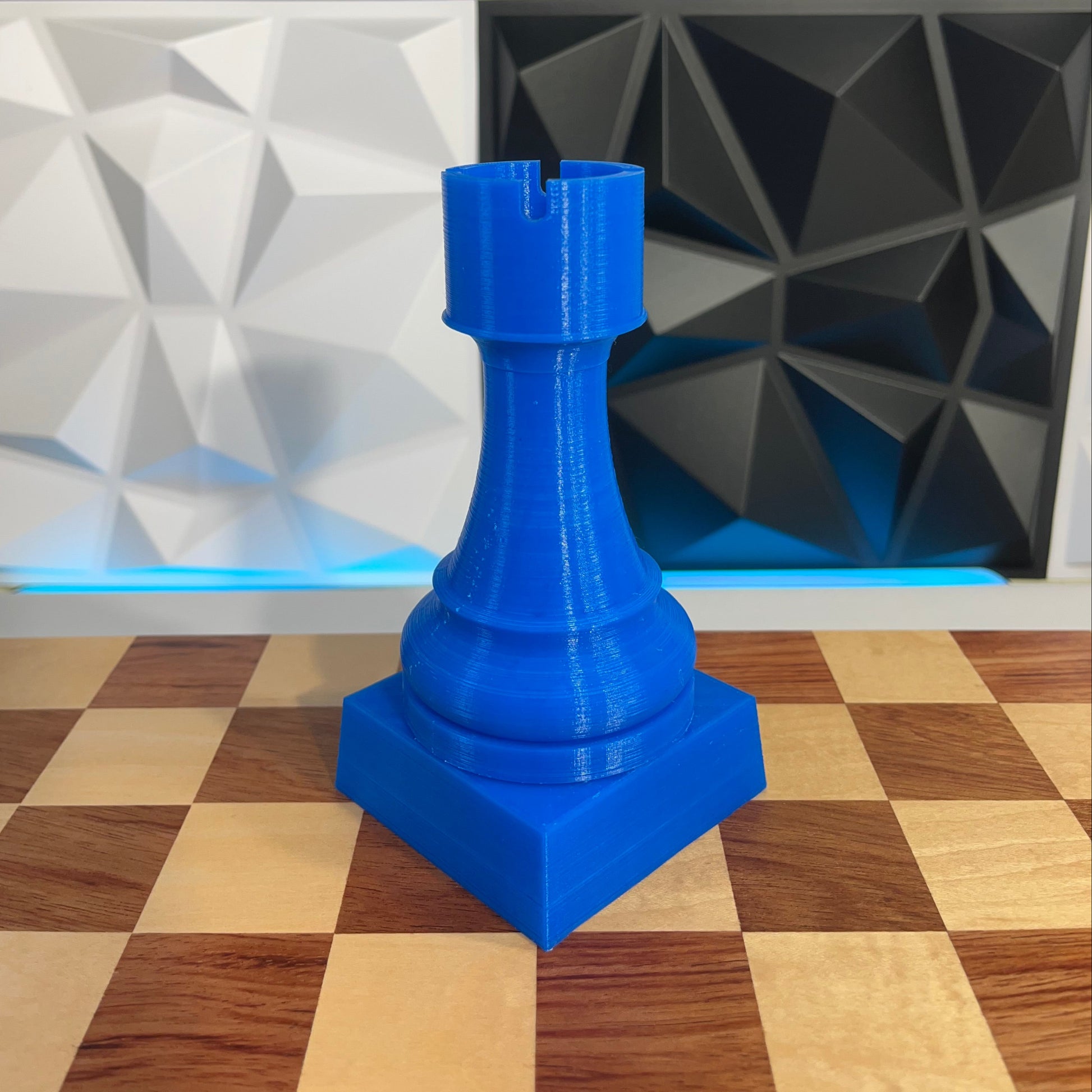 Trofeu fet amb impressora 3D amb la forma d'una torre gegant d'escacs. Mesura 15cm d'alt (12,5cm la torre + 2,5cm el pedestal). Actualment està disponible en blau. Contacteu-nos si ho voleu en un altre color.